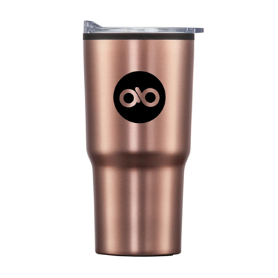 When all else fails, you can always count on a coffee theme. This beautiful rose gold tumbler is a solid option. Going with something that has this almost brass-like finish, along with the bevel, helps the tumbler stand out and appear more like a museum piece than your go-to paper cup or coffee mug.